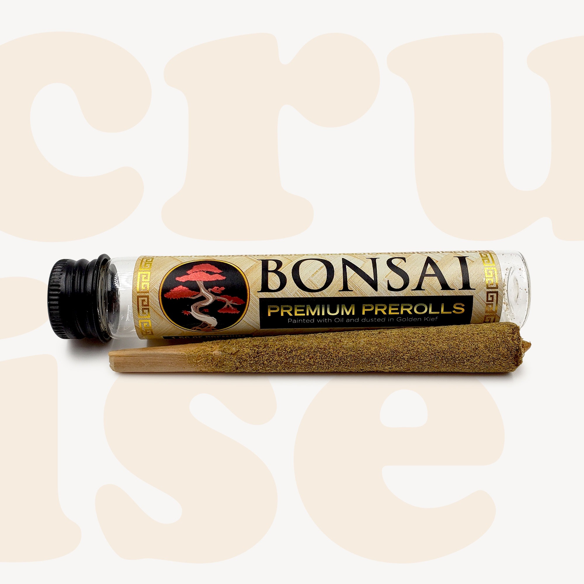 Bonsai Premium Prerolls 1.5 grams of OG base flower, mixed with shatter, painted with ultra-refined Distillate Oil and dusted with Golden Kief. This is the high-quality, top-shelf pre-roll you have been waiting for! All-Natural Terpenes used to create 16 amazing flavors.