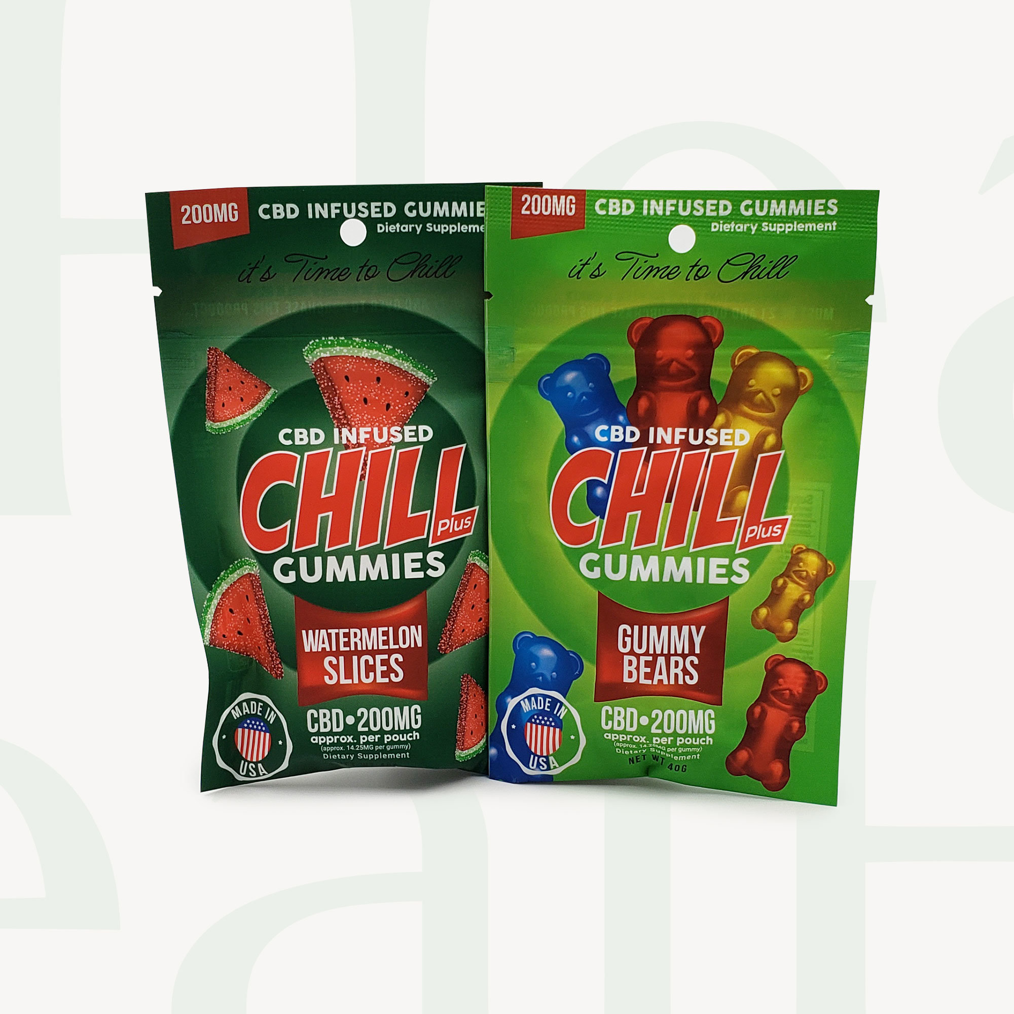 Chill Plus Gummies (200MG CBD) CBD has never been so tasty! Try 200mg of hemp-derived CBD in this portable, resealable bag. Perfect for on-the-go healing. Choose from the Gummy Bears or Watermelon Slices!