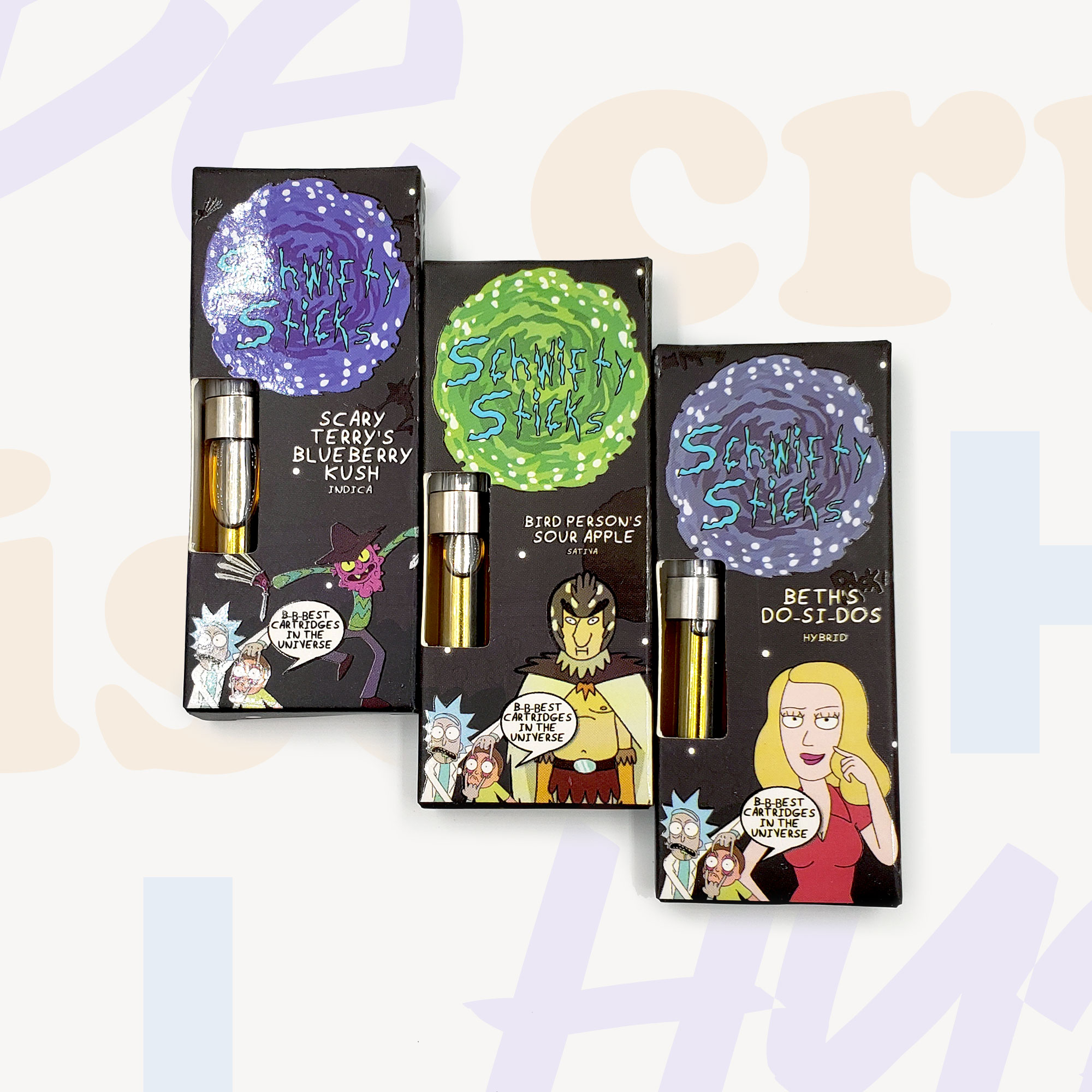 Schwifty Sticks FULL GRAM Cartridges You gotta get schwifty! Check out these R&M inspired cartridges. Tasty cannabis oil available in 10 different flavors. Testing at 89%+ THC.